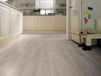 Linoleum with imitation "under the laminate", as the name implies, will have a pattern with stripes in the form of the laminate panels themselves. The material may be light or dark. Under the bright linoleum with imitation of the laminate should be understood floor covering, which has an almost white color. This shade was called "Bleached Oak". The bands on it can be either a tone darker than the general background or lighter. Typically, this color palette is used in private homes, as with the passage of a large number of people, the color is quickly erased.