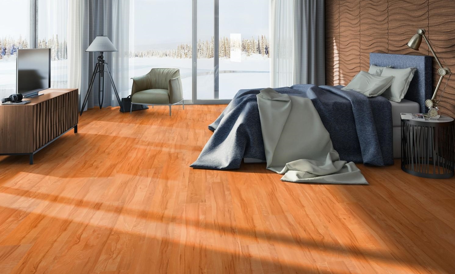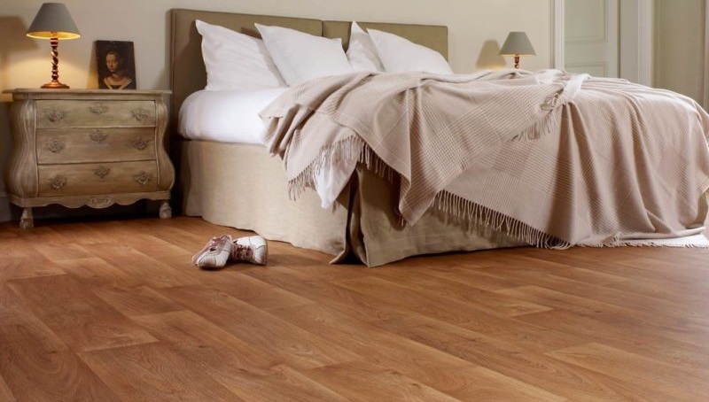 The bedrooms with a bright, yet calm color flooring look very beautiful and aesthetic. The selected linoleum is similar in color to furniture and walls, but at the same time, it differs favorably from them, bringing a zest to the overall interior.