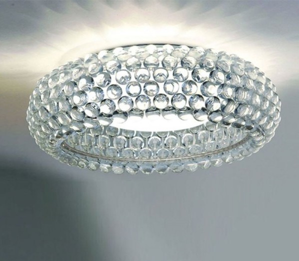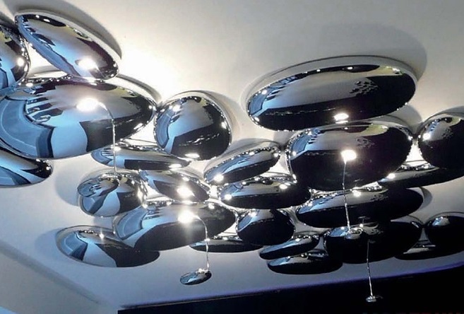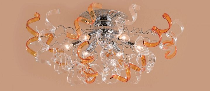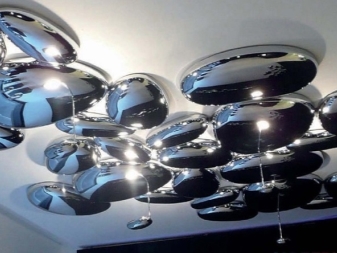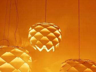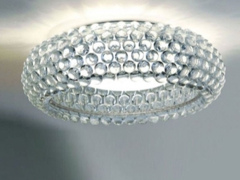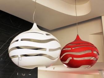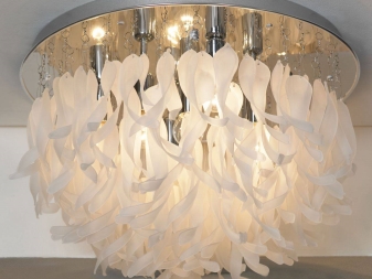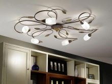 - Ceiling designer lamps. This option is suitable for a room in which low ceilings. As a material for the ceiling can be used any raw materials, made in the form of a geometric figure. Such chandeliers are suitable for any room. The disadvantages include the fact that the replacement of the lamp is impossible without removing the ceiling itself;