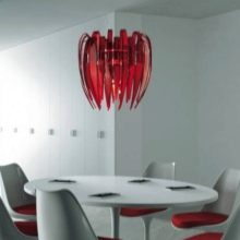 For fans of experiments, there are bold tones of red, black, blue, green and other colors. Designers are advised to choose chandeliers, the color of which will occupy the second dominant place in the interior. For example, if the room is decorated in black, and small components have a white pigment, you can use a white chandelier.