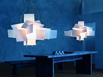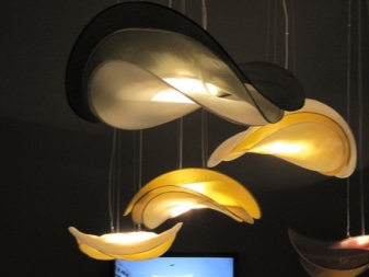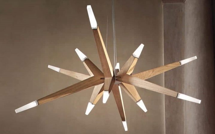 Modern models can combine volumetric technology. Different materials are used for such lamps. There are designer chandeliers made of glass, anodized or chromed steel, wood, ceramics, fabrics and glass.
