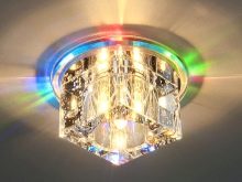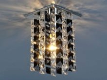 - Inline. These lamps have the same method of fastening as overhead. Their advantage is in spring mounting. To fix the built-in chandelier, simply insert the spring mounting into the stretch ceiling. After installation, the spring straightens out, which guarantees that the luminaire is pressed tightly against the headlining. Decorative overlay allows you to visually merge the lamp with a stretch canvas. When choosing the type of etigo, it is worth remembering that the task of the built-in lamp is to illuminate the room. This type of lighting is very popular in office space. The built-in lamp will please not only with high-quality lighting, but also with its price, because it is the most inexpensive option presented.