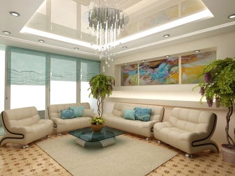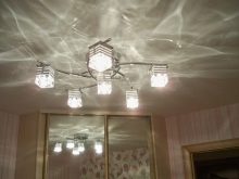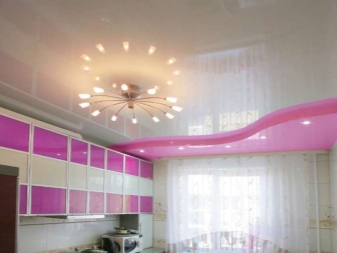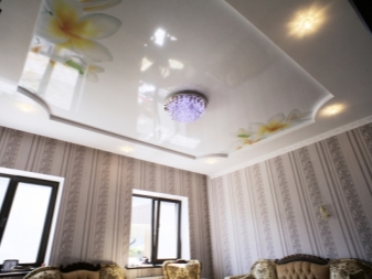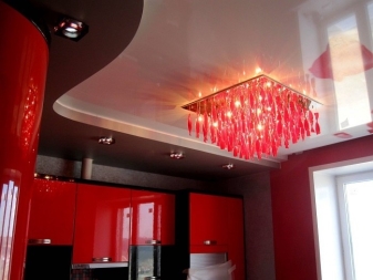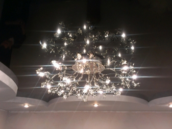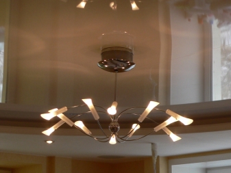 The price category of chandeliers under the tensioning fabric directly depends on the form, materials of their execution.A great choice for the fastidious stretch ceiling will be lamps with horns pointing down, the same goes for the shades.