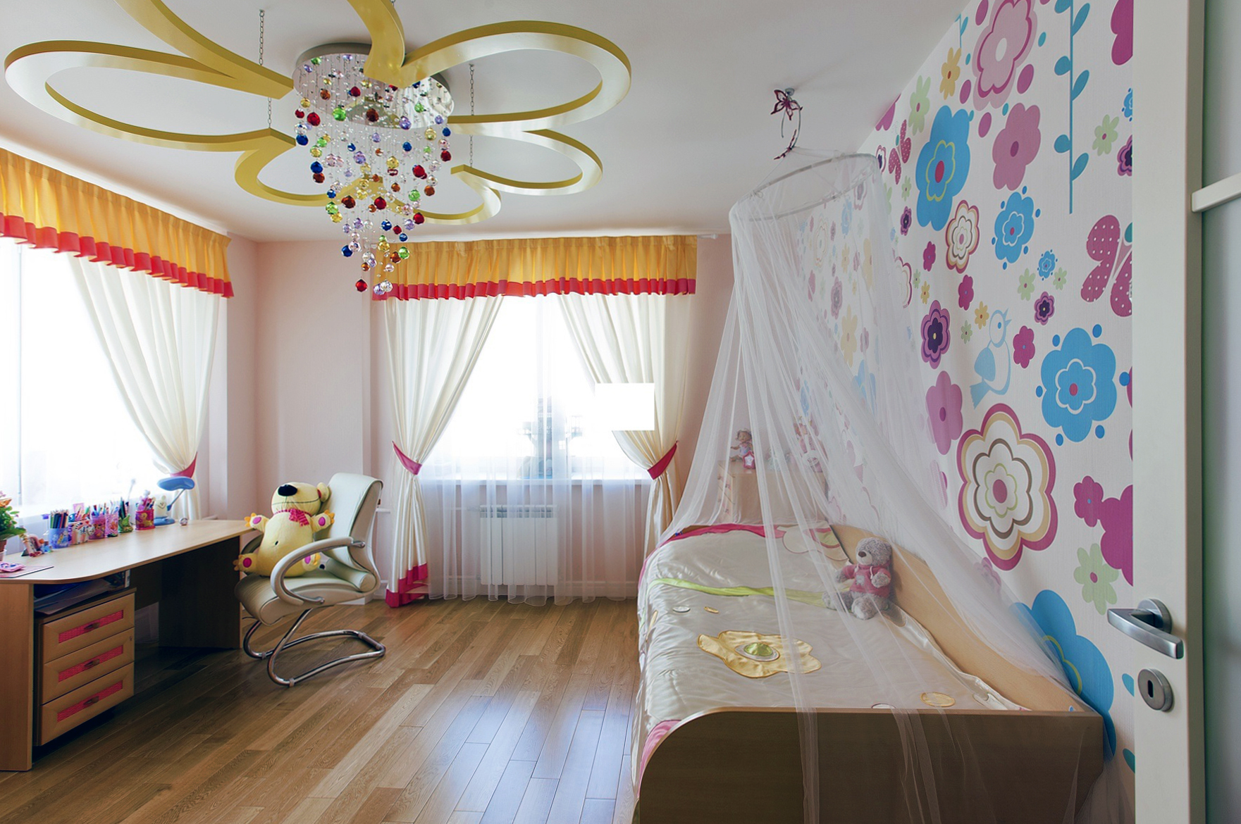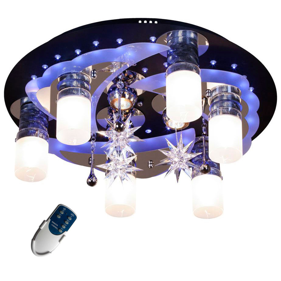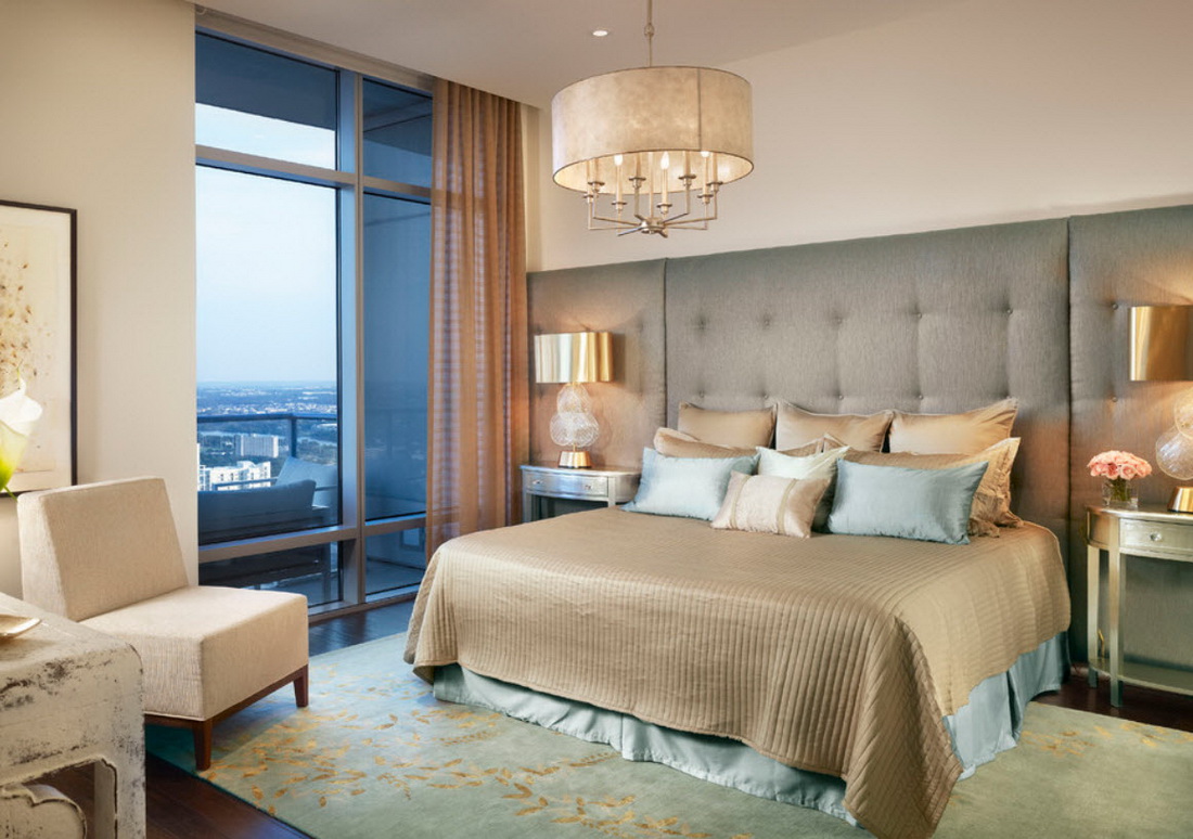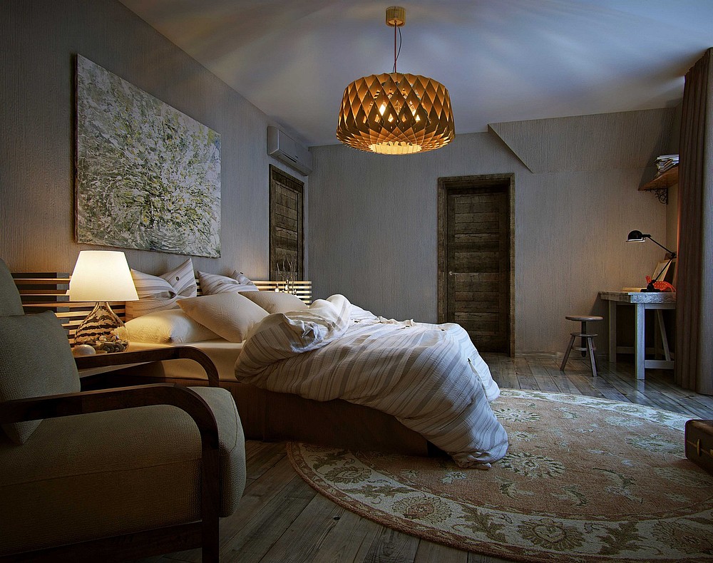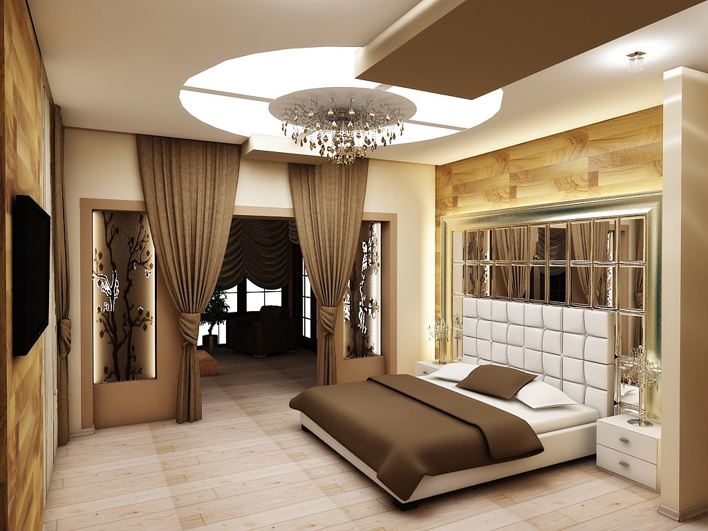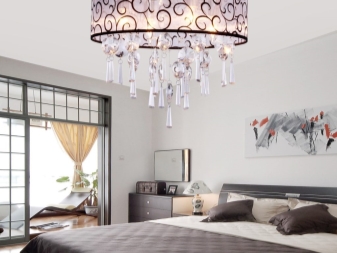 Bedroom. A bedroom is a kingdom of peace and comfort. The chandelier is obliged to harmonize with the interior, merging with the situation, but not getting lost in its background. Priority materials for bedroom chandeliers are frosted glass, crystal, and light-colored fabric shades. Luminaires with multiple lighting modes and with remote control are not only convenient, but also help to create an atmosphere before bedtime.