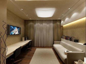 - LED. The safest choice for suspended ceilings. Diodes emit very little heat and can not damage the fabric, in addition, they shine much brighter than standard lamps and will not harm the eyes. The service life of the diodes will pleasantly surprise with durability.
