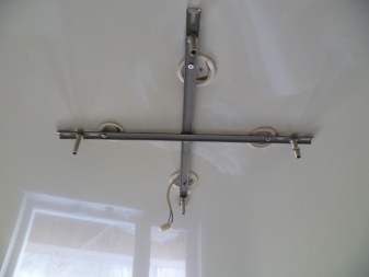 This type of attachment is very simple and convenient. First you need to find the center of the ceiling and determine the level of the canvas in this place. In the center of the ceiling is mounted wooden beam. It will be an error to attach a timber below its level. The quality of the installation will depend on how accurately the lumber is attached and the wiring is removed. Before you stretch the ceiling, check the wiring, as after the completion of the work it will be impossible to replace it without damaging the canvas. Such strips are bought separately, height adjustment is built in some of them.