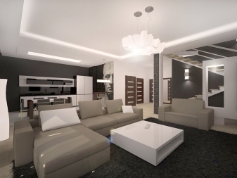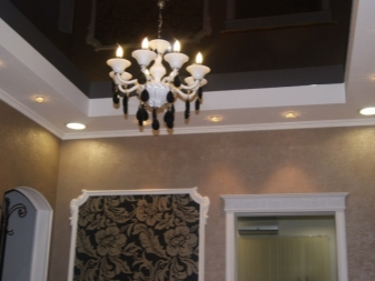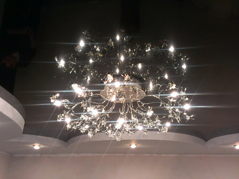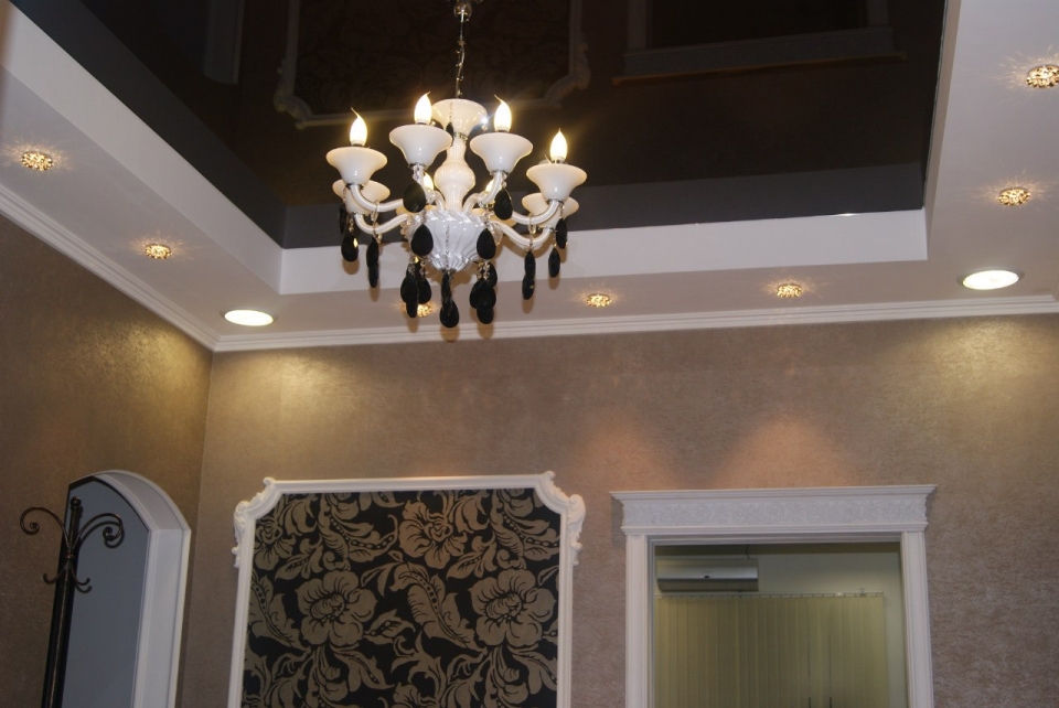 A chandelier in a contrasting color would be appropriate on pastel-colored stretch ceilings. The white lamp will create a stylish combination with a black and chocolate stretch ceiling.