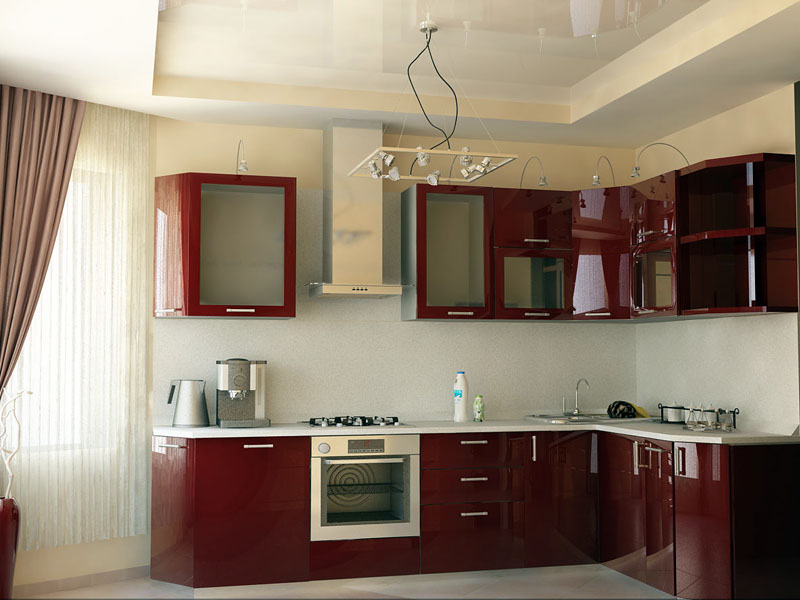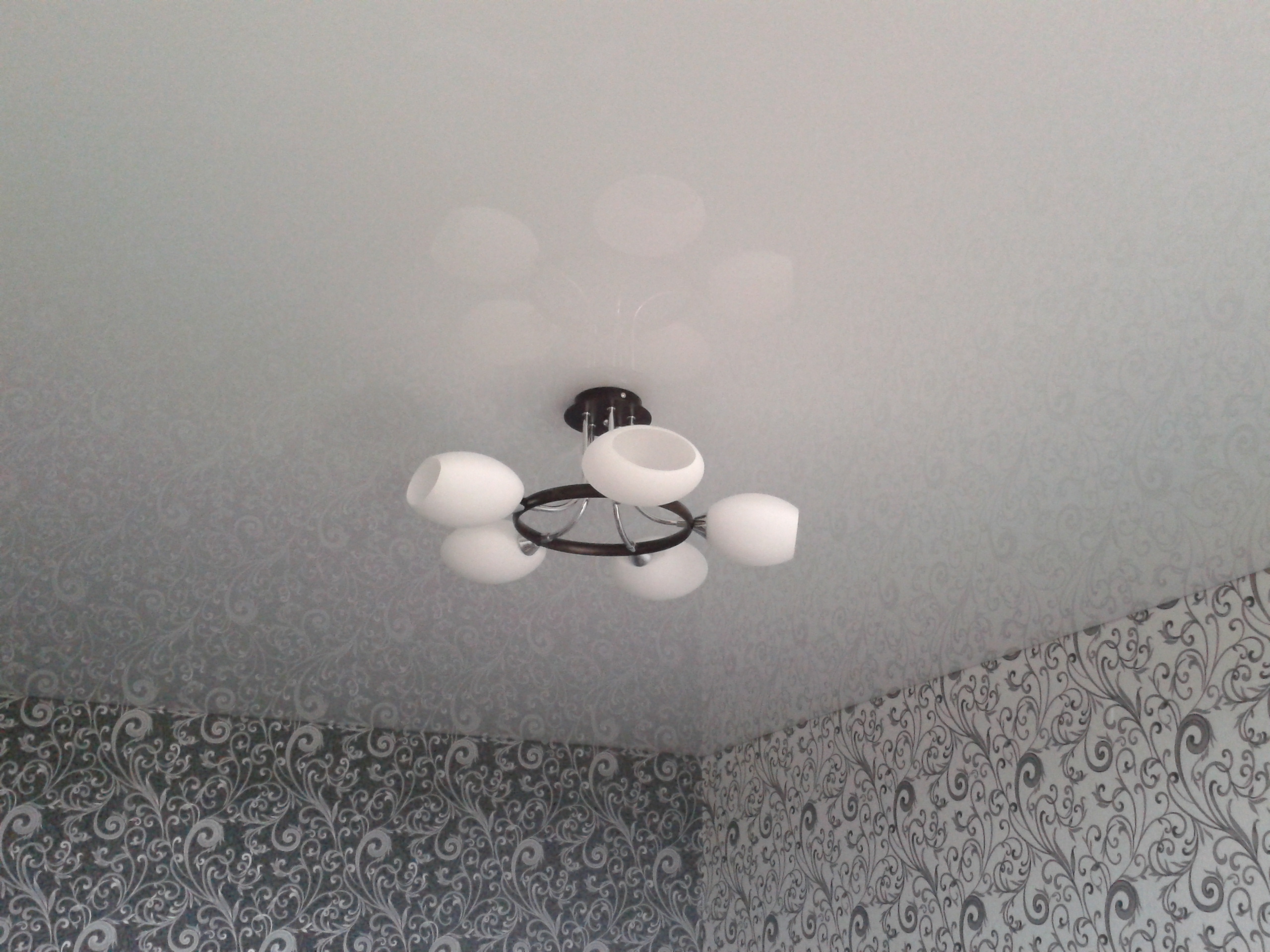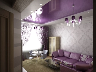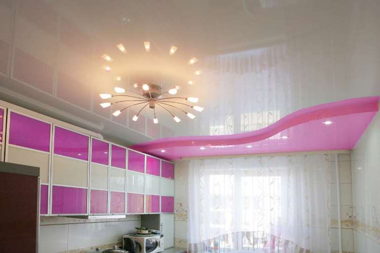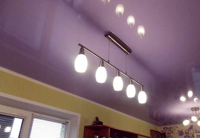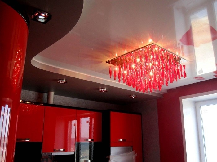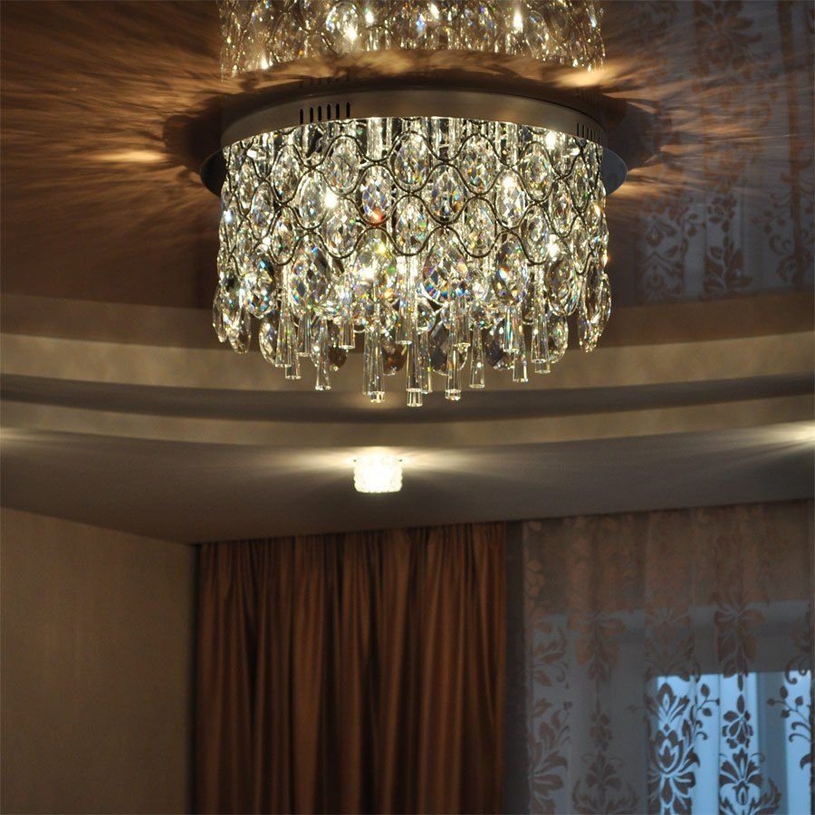 The glossy surface of the tension cover is the place for the chandelier of fancy shapes and shades.In addition, try to choose the color of the chandelier, which will be secondary in the overall picture of the room. If you find it difficult to answer which color you need, stop at a white chandelier and you won’t regret it. This is a classic. It is suitable for any interior and will add peace and balance to the atmosphere.