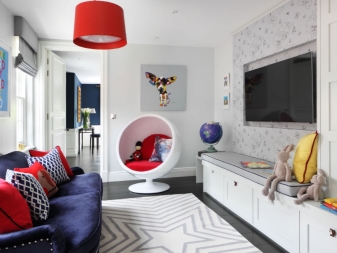 Various drawings around chandeliers, photo printing or painting can be attributed to non-standard methods of decorating the room.