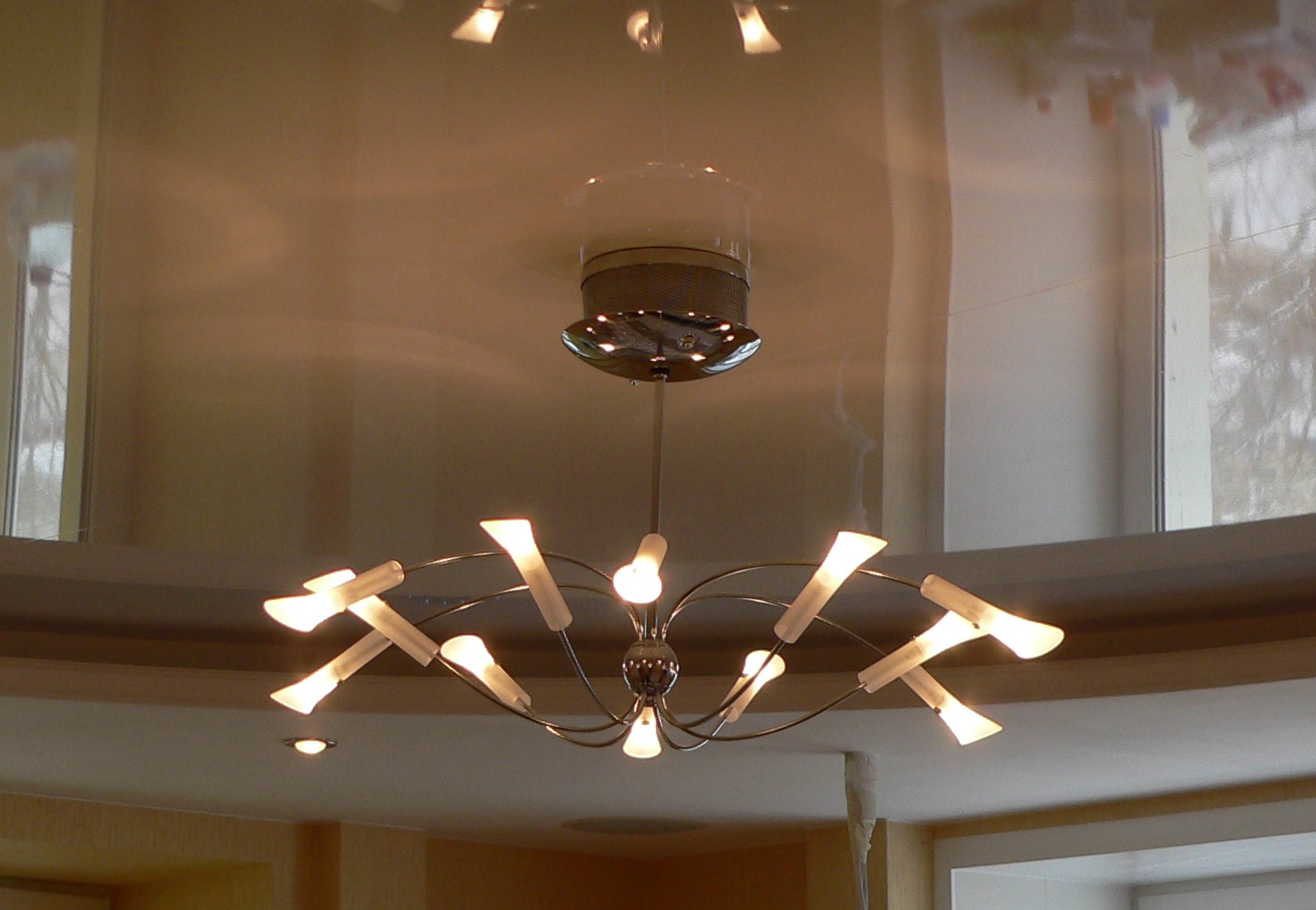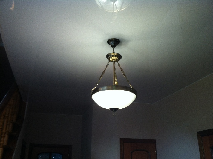 The top of the chandelier has no less value than its lower part. In the upper part there should be no wires and protruding parts, because they will be reflected in a glossy surface and spoil the overall look in the room. Stop on the lamp with a large bowl, which is able to hide all the errors of installation.
