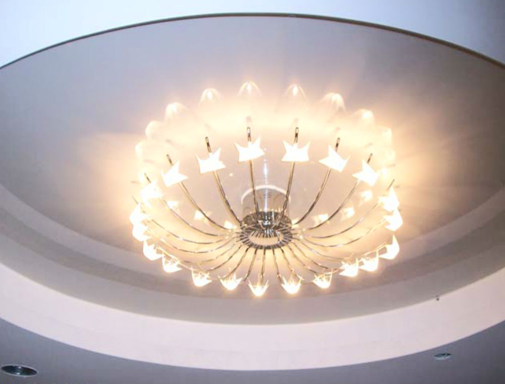 - Overhead. Before you install the invoice chandelier, you need to prepare the base with the wiring. The next step is the installation of the ceiling itself. Then glue overlay rings on it and make holes in the right places. Overhead chandeliers in this case are installed directly on the canvas.LED lamps will serve you a long time in tandem with an overhead chandelier. The power of these lamps will be enough to illuminate the room, and the ceiling will not overheat. The overhead chandelier is significantly inferior in price to hanging lamps.