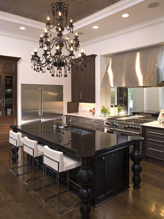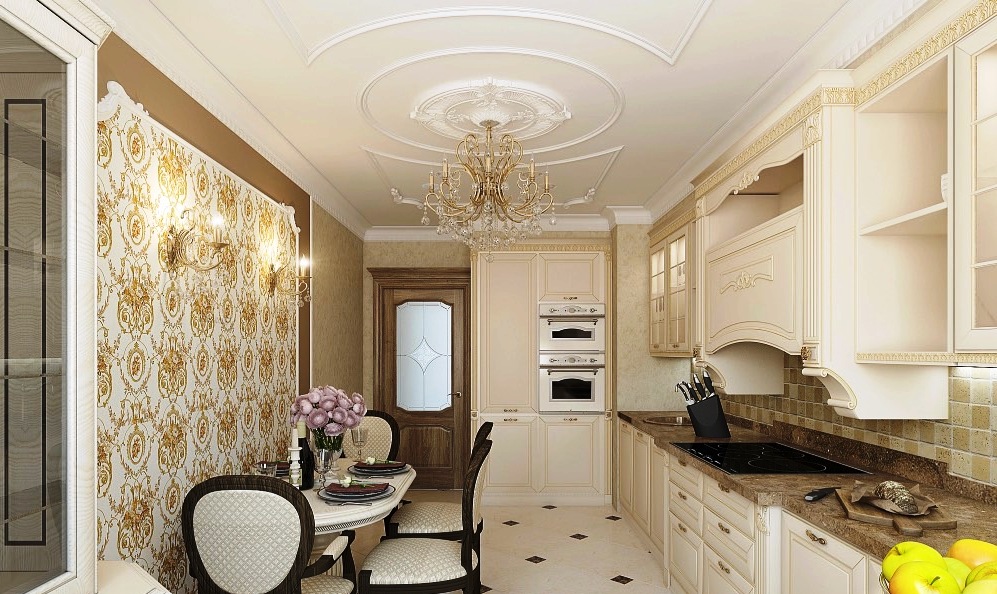 Original chandeliers dilute the interior of the kitchen.