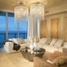 Chandelier in the form of a fountain will be a highlight of the interior.Such an outline is manifested due to the cold glossy gloss of the reinforcement and the finest iridescent threads with pendants-drops, which form an imitation of the moving water. Such non-standard lighting technology brings an unearthly, cosmic atmosphere.