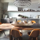 Small-shaped ceiling lights look great in the kitchen. They add zest to the kitchen setting. Look great with glossy cabinets facades, snow-white household appliances and various utensils. The environment will become more elegant, more unusual and more expressive due to overflows.