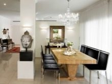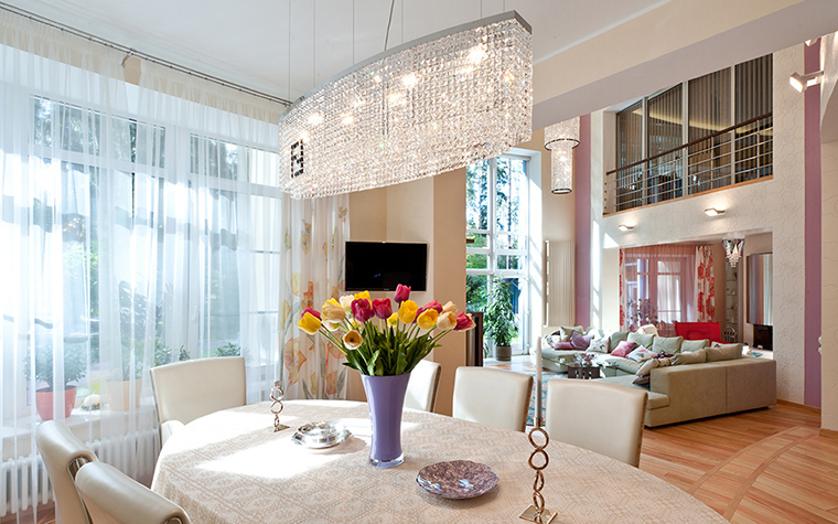 The formula for determining the height at which it is appropriate to place the light is quite simple - there should be at least 190 centimeters between the floor and the appliance, in the dining area the distance to the table should not be less than 80 centimeters. For the kitchen, you must take into account the diameter of the table. If it is small, then it is better to purchase a medium-sized chandelier. By analogy, we choose for bedrooms and recreation areas - the wider the bed, the more massive the lamp.