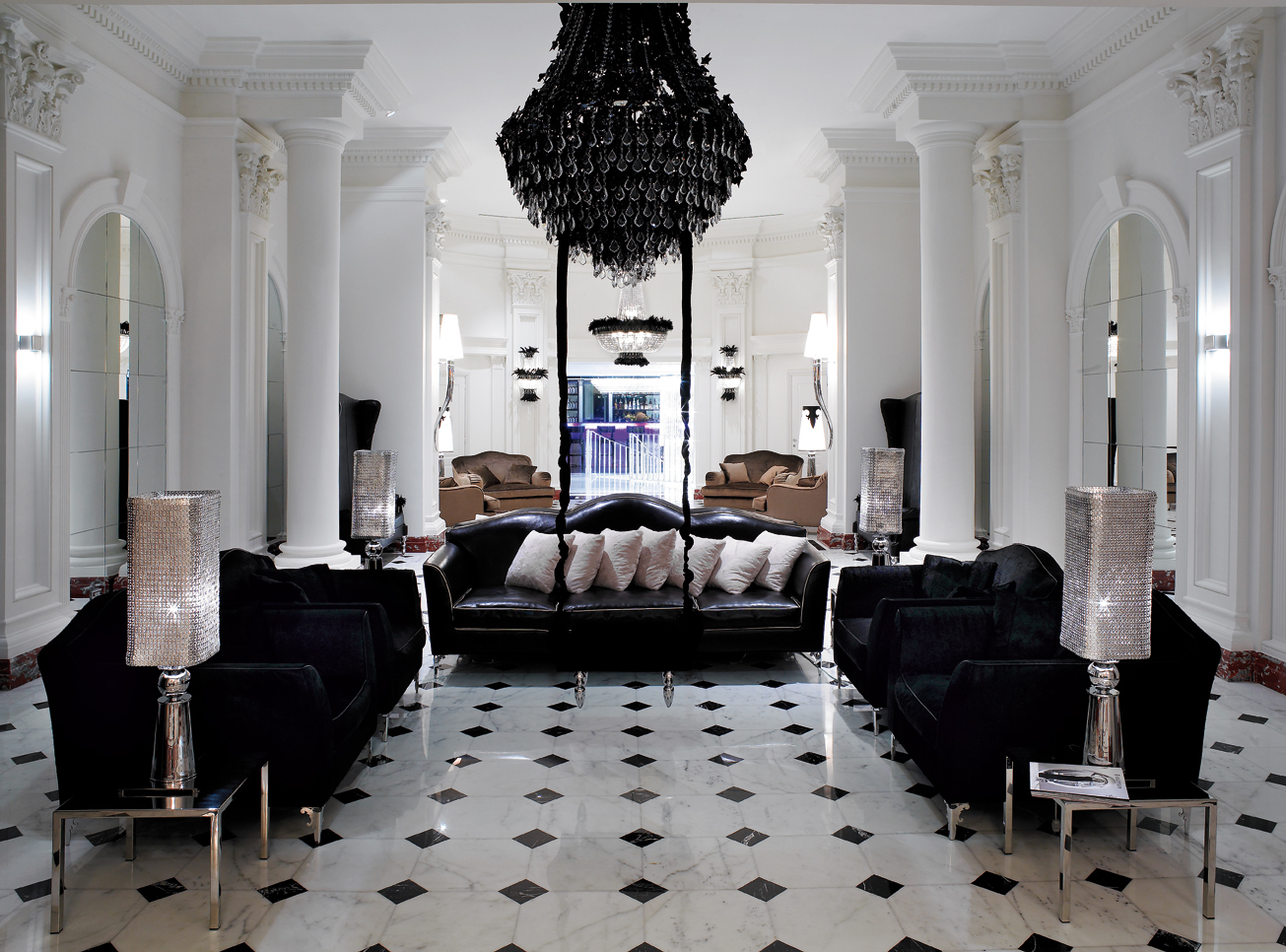To create an atmosphere of glamor, luxury and aristocraticism, designers develop products using expensive materials - Bohemian glass, marble, silk, velvet, Swarovski crystals, natural stones - like semi-precious amethysts, agates, chalcedony, aventurines, onyx, corals, and precious - sapphires , emeralds, rubies.