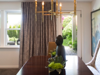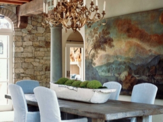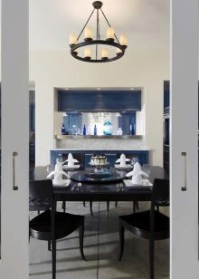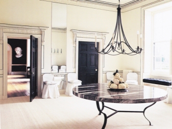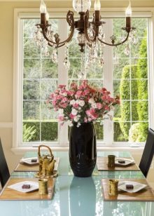 Forged chandeliers with candles - is another matter. They will become a center accent, which is simply unrealistic to overlook. And they are not at all part of only expensive interior. Cascade form, a minimum of materials and colors will suit a minimalist interior. But if a more graceful and characteristic chandelier was chosen, for example, with bronze monograms, it is worth supporting it with other forged elements, for example, a stand for flowers.