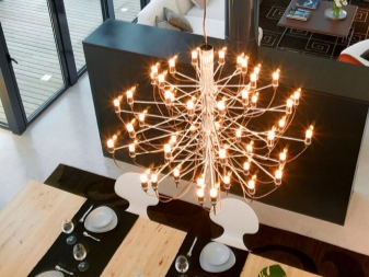 Many models of chandeliers in the shape of candles are decorated with different glass elements and crystal pendants. Some have gilded fittings, so that the appearance of such products becomes more beautiful and original.