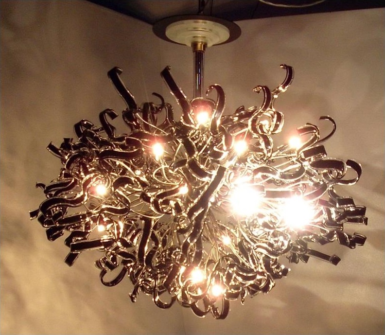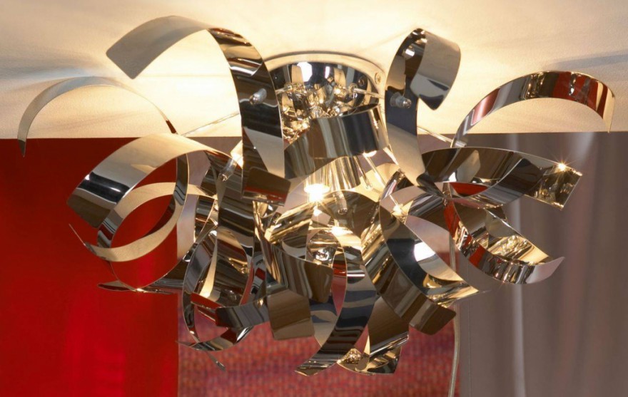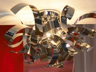 Among the fashionable variants of this year are high-tech chandeliers. They may have the most unimaginable forms, but mostly made of plastic, metal or glass. This direction is more stringenthowever, no one will prevent you from bringing a touch of brightness to it.