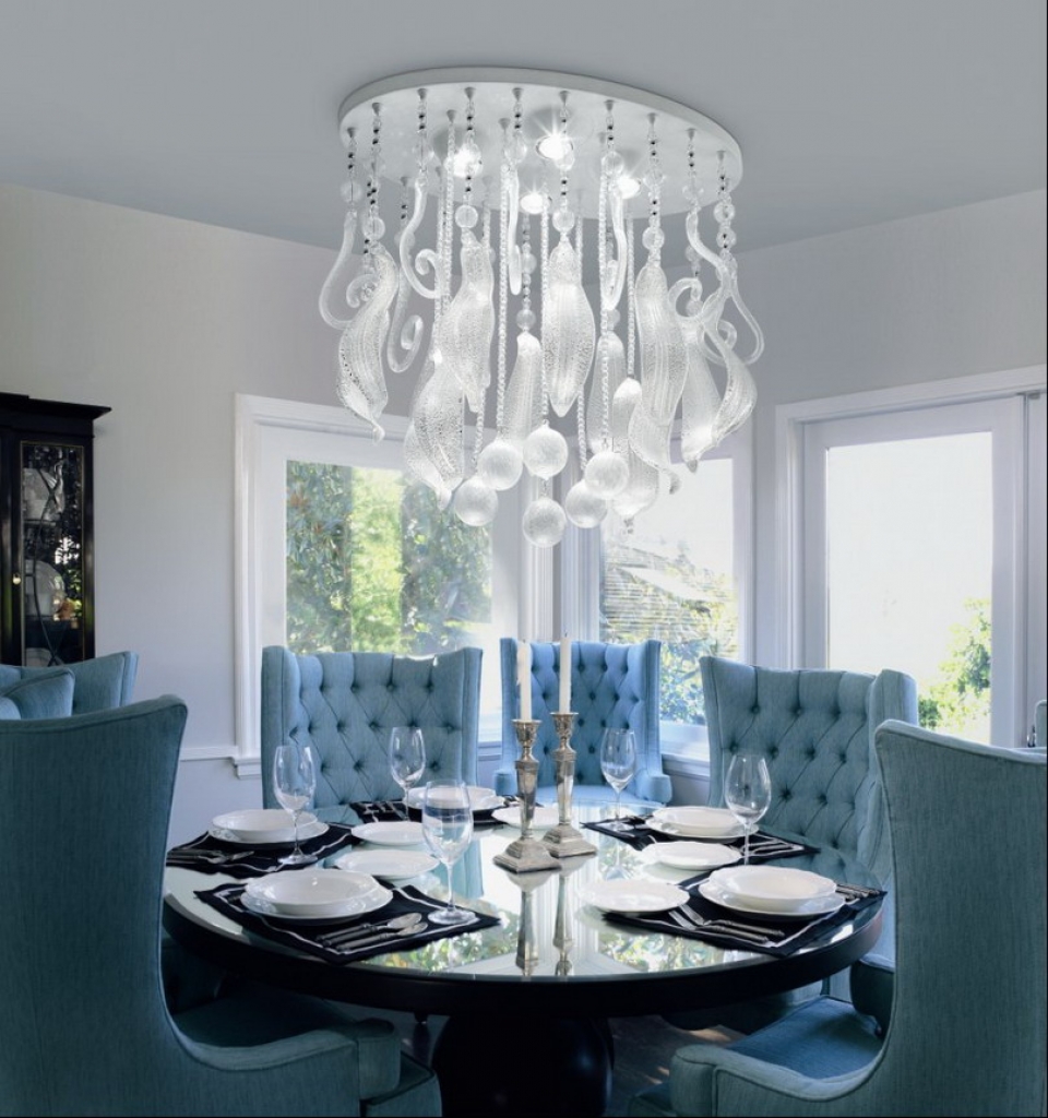 Such options may consist of a single or several lampshades, which are attached on a cord or chain. Basically, suspended chandeliers are placed at an impressive distance from the ceiling. The length of them can be conveniently adjusted. As for the ceiling of these models, they are made of different materials, for example, plastic, cloth, glass.The latest options are very popular.