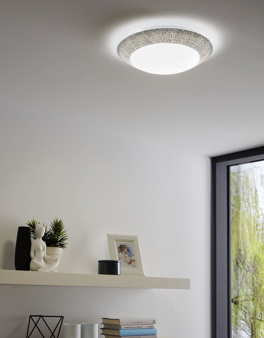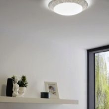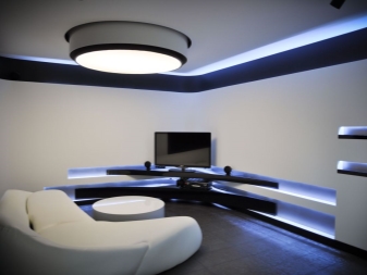 The lamp similar to the pancake will fit well in modern style. Sometimes designers offer interesting solutions by adding appliques or drawings to ordinary factory ceilings, converting, for example, large semicircular lamps to the Moon - using satellite relief patterns on thin paper. This paper can be glued to the ceiling, and it will pass light.