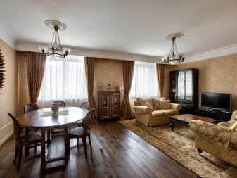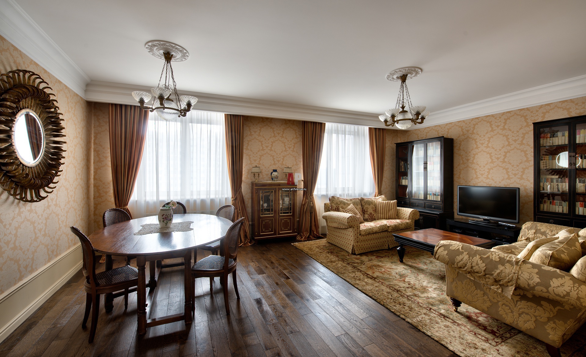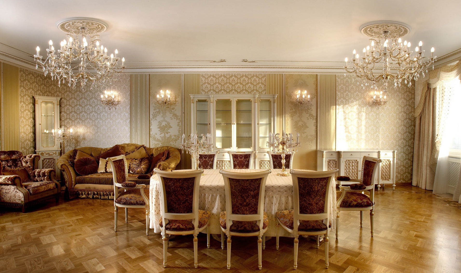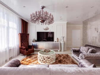 - Stalin's Empirepresent in many buildings of the USSR, is always recognizable for its brevity and scale. These features are reflected in many details of the interior, including ceiling lights.The chandeliers are often based on a round metal construction with a dome, branches from the form of chandeliers or additional lampshades depart from this part. Mandatory attribute in chandeliers - crystal and expensive materials. Color plafonds usually white or aged in warm colors.