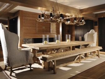 - At the heart of the chandeliers in style "chalet" lies a metal frame in the form of a round hoop. On it are lamps, which represent an imitation of candles or ceiling lamps of a different form. Often the frame is decorated with a rope covering or elements of wood, which emphasize the whole non-standard and originality of style. Ceiling type products often represents a wooden round frame with built-in lights.