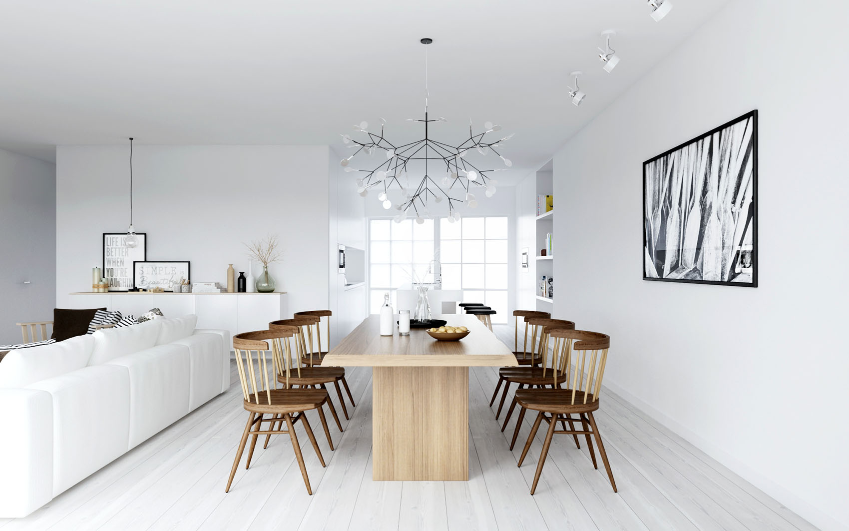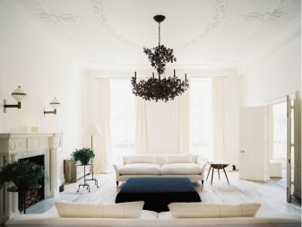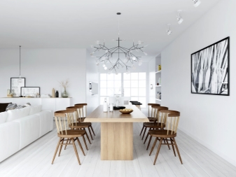 - Main color in the Scandinavian direction - white. You can use single large structures in which the ceiling resembles a dome in shape. It can be made from solid material or from spaced plates. The latter option allows much more light into the room. The frame of the Scandinavian chandelier often consists of curved branches of a dark color, at the ends of which there are small lamps.