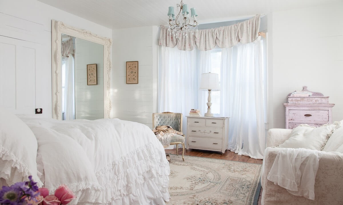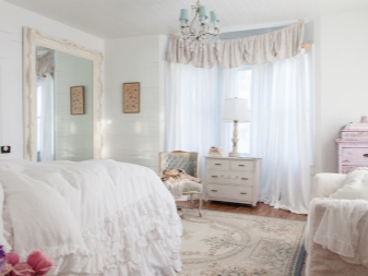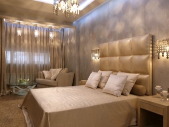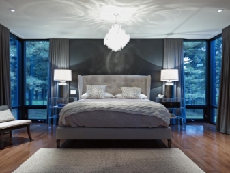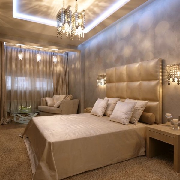 Sometimes the ceiling chandelier is combined with small lamps on the bedside tables or sconces.