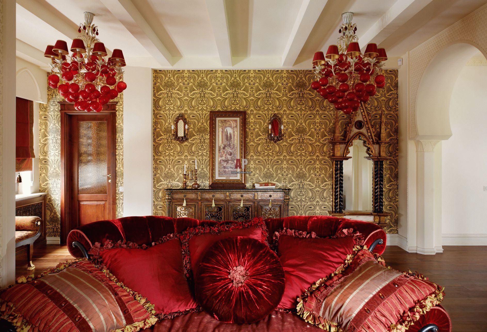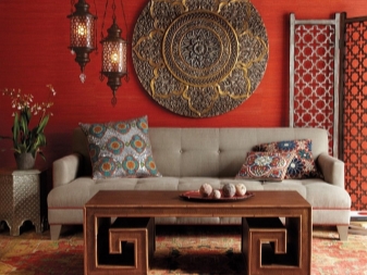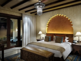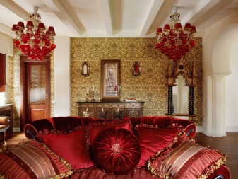 - A real riot of colors are chandeliers. Arabic style. Suspended structures, made in the likeness of light bulbs, are made of carved metal and are often located immediately in groups on chain-cables. Muffled light penetrates through the slits in the design, creating a special atmosphere in the room. But it is difficult to fully illuminate the room, limited only to the lamp-lamps, so in addition to them choose the main ceiling chandelier with a dome in the form of a dome.It is decorated with multi-colored glass like a stained glass window or pendants that demonstrate the luxury of a room.