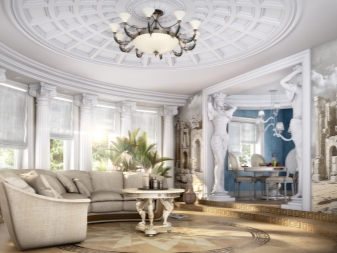 - Light round ceiling with an ornament on the edges characteristic of the ceiling chandeliers Greek type. The product may consist of one marker lamp or several lamps located on the frame of a bronze or golden hue.