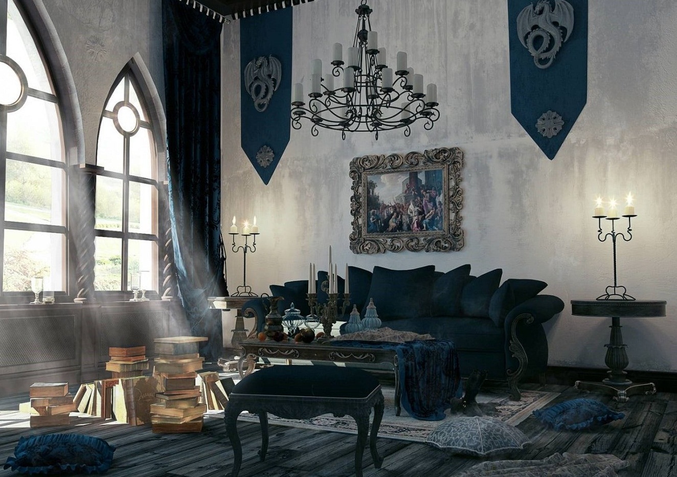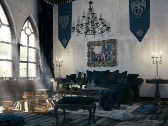 - Gothick style does not accept small sizes and simple designs. Dark-colored chandeliers are very massive. They are made in the form of fancy interweaving, looking up candelabra, dark beads and pointed plates.