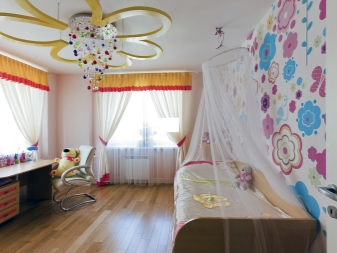 A powerful lamp, framed by a colored floor lamp of unusual shape, is most often picked up in the nursery. Many stores offer funny ceiling lamps specifically for the decoration of the smallest room.