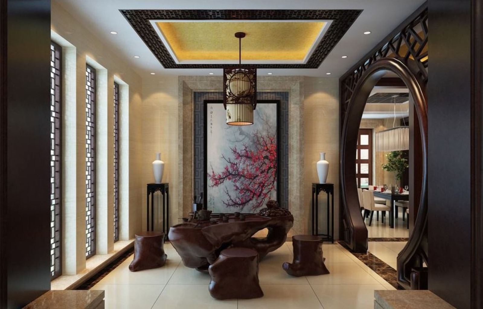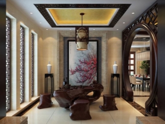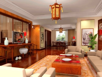 - Chinese style - original direction, reflecting all the subtleties of the East. Overhead lighting plays an important role in the interior, because it reflects part of the traditions of China. Ceiling chandeliers are voluminous, they can be made from fabric or natural materials, imitate Chinese ornaments in shape, and contain images of dragons, hieroglyphs or elegant tassels.
