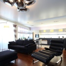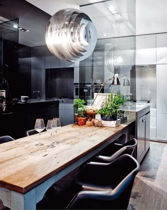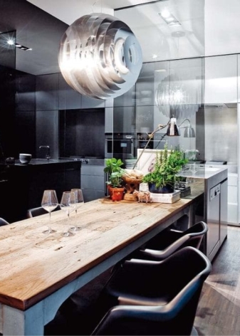 - For mirrored ceilings, the best option would be to install spots or pendant lamps of large sizes. This combination will not only emphasize the urban design of the room, but also visually increase the space.