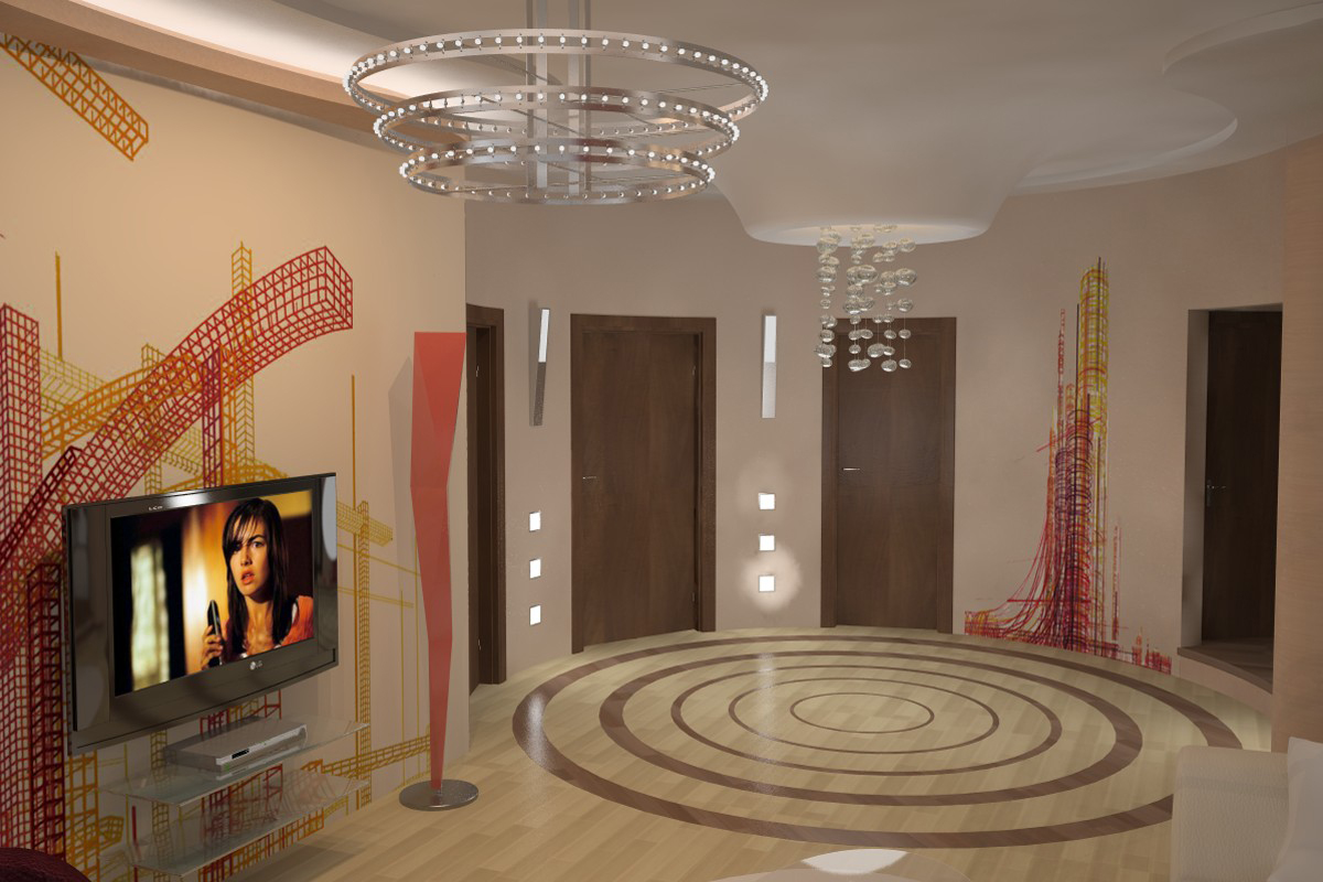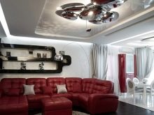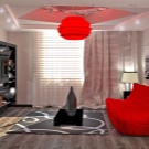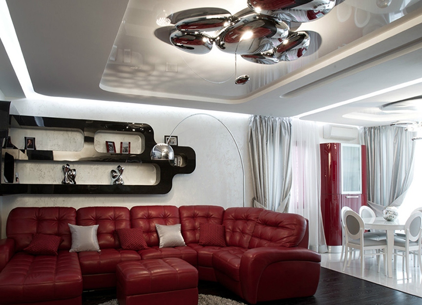 - The interior is hi-tech devices are used not only restrained tones. A bright red chandelier is perfectly combined with pieces of furniture and designs in the living room. A bright chandelier combined with subtle tones can create a harmonious picture.