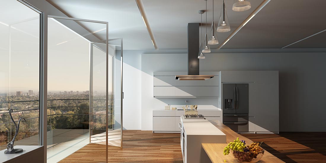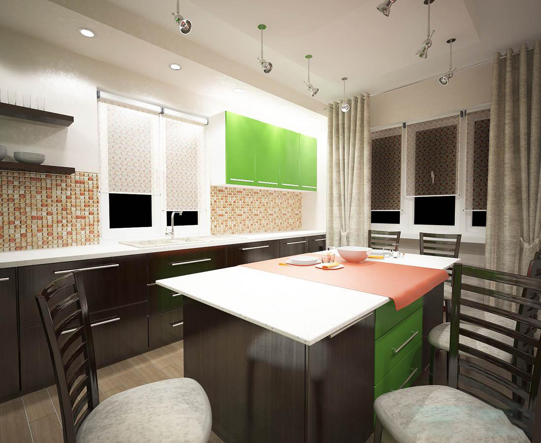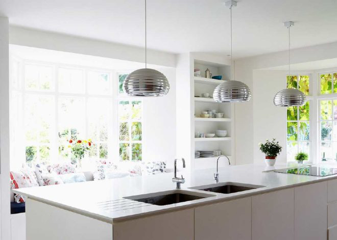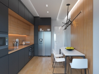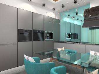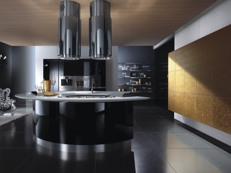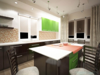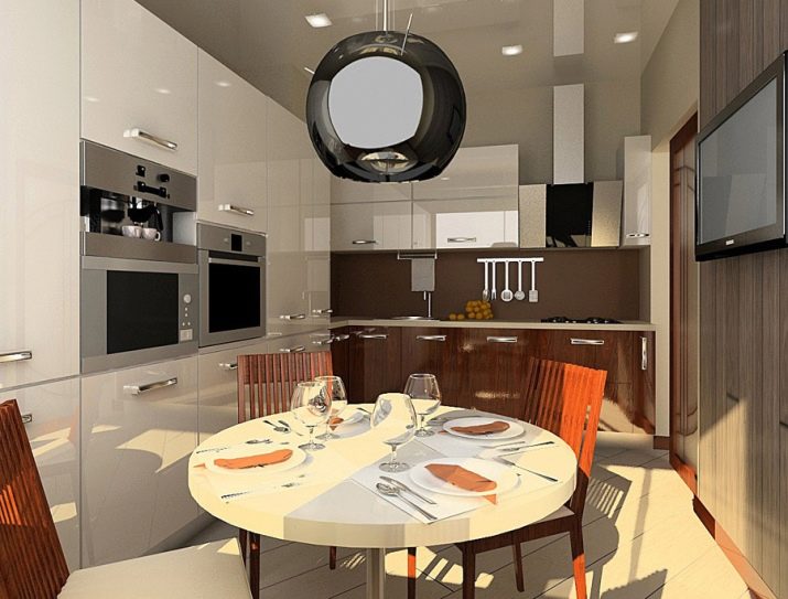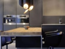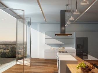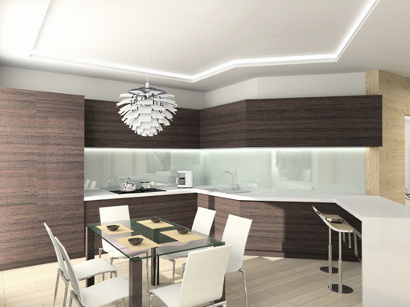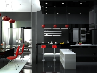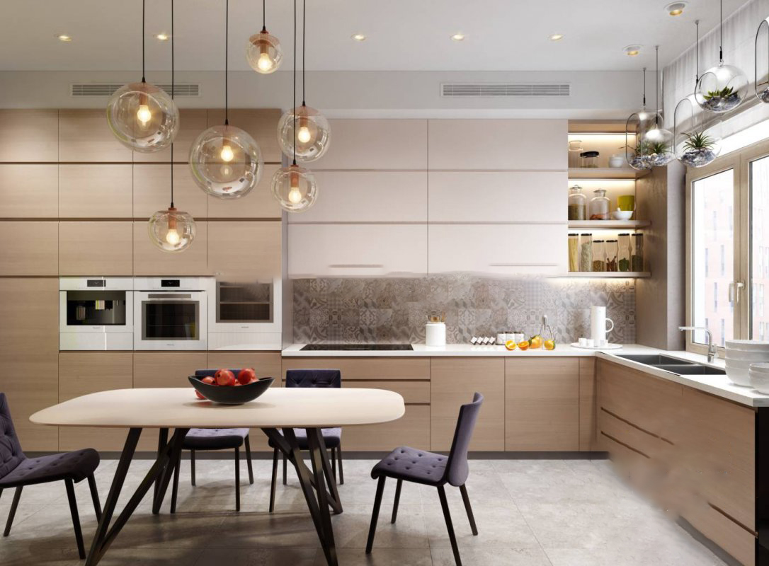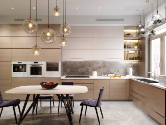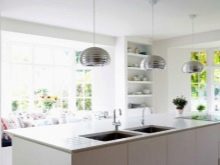 The plan for installing lighting fixtures in a large kitchen has some special features. In this case, it is worth paying attention to the need to separate individual zones.As a rule, light emit the dining area. From products with frosted shades in large kitchens should be abandoned. For the filling of such a room with light, chandeliers with large transparent shades are suitable.