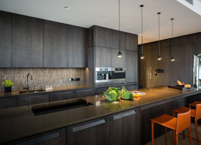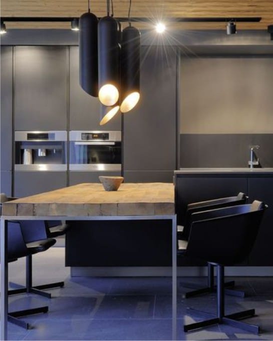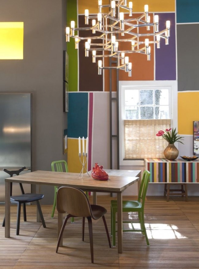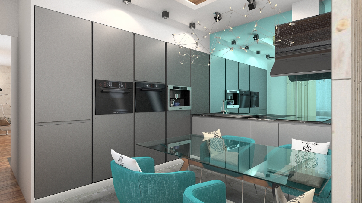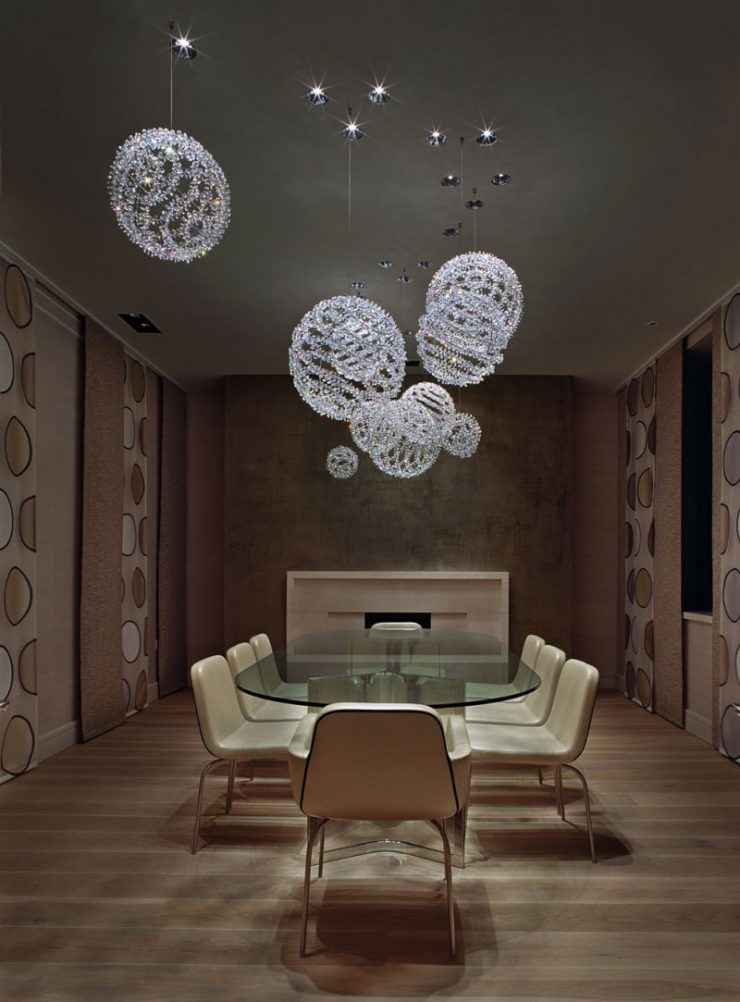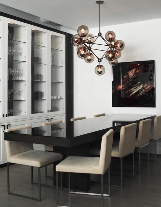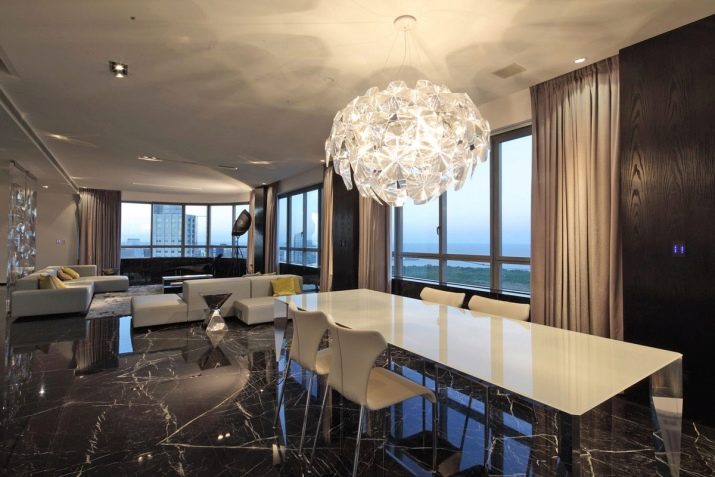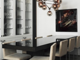 - To highlight the dining area It is worth hanging the chandelier right above the table. Custom-looking lamps in a futuristic style.