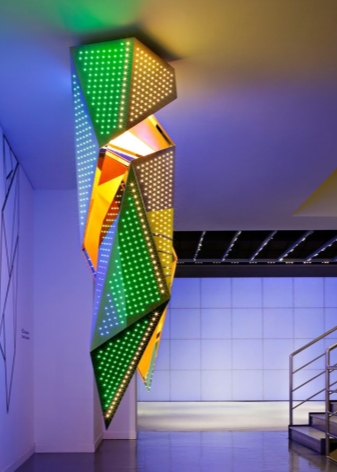 - Chandelier hi-tech unique color and original form looks like a separate piece of art. A room with such a lighting device becomes like a spacecraft.