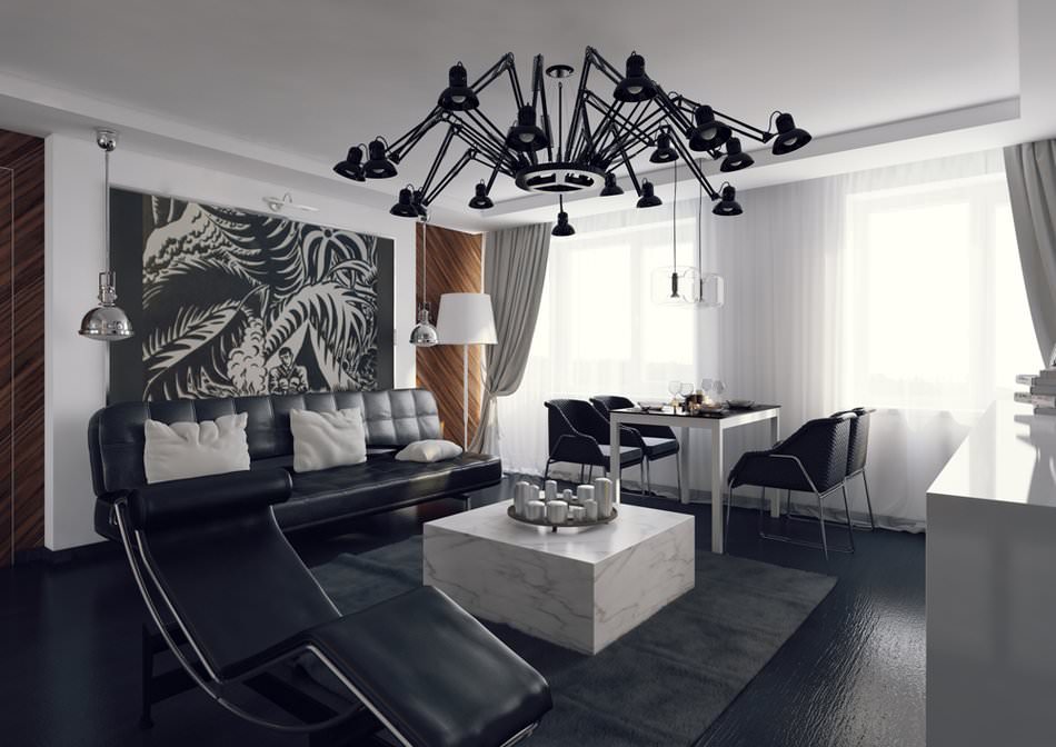 To illuminate a room with dark furniture is to choose a model of the chandelier, which is designed to use high power bulbs. This will maximize fill the room in dark colors with light.