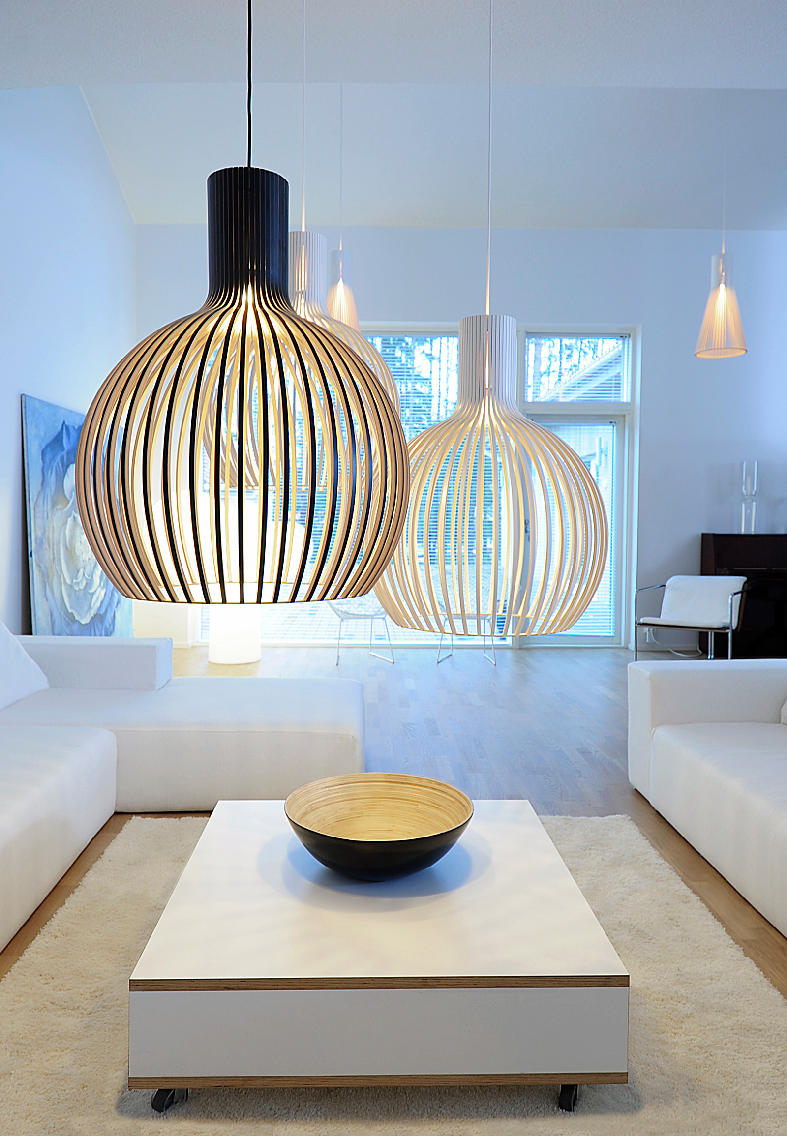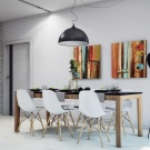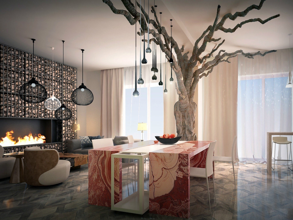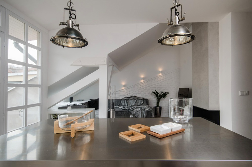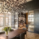 Unusual metal suspensions look like painted against a gray wall. The geometric design and pure white color combine amazingly, forming a stylish modern duet. A group of chandeliers catches the eye, acting as a fundamental nuance of the interior.