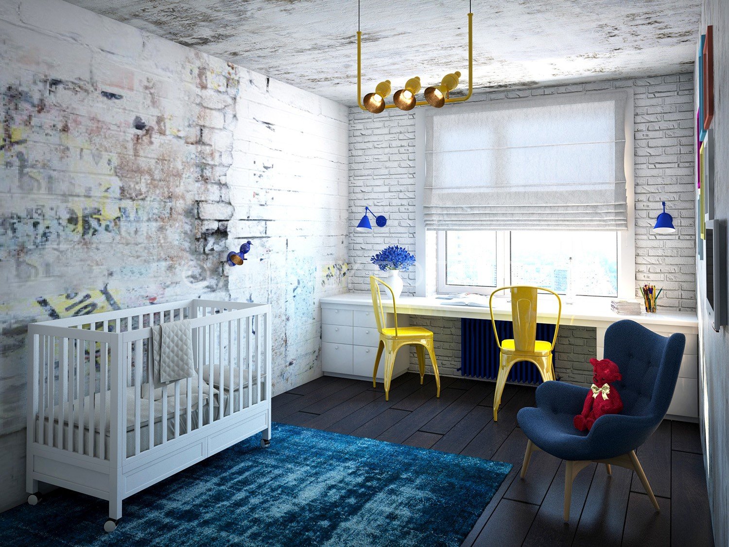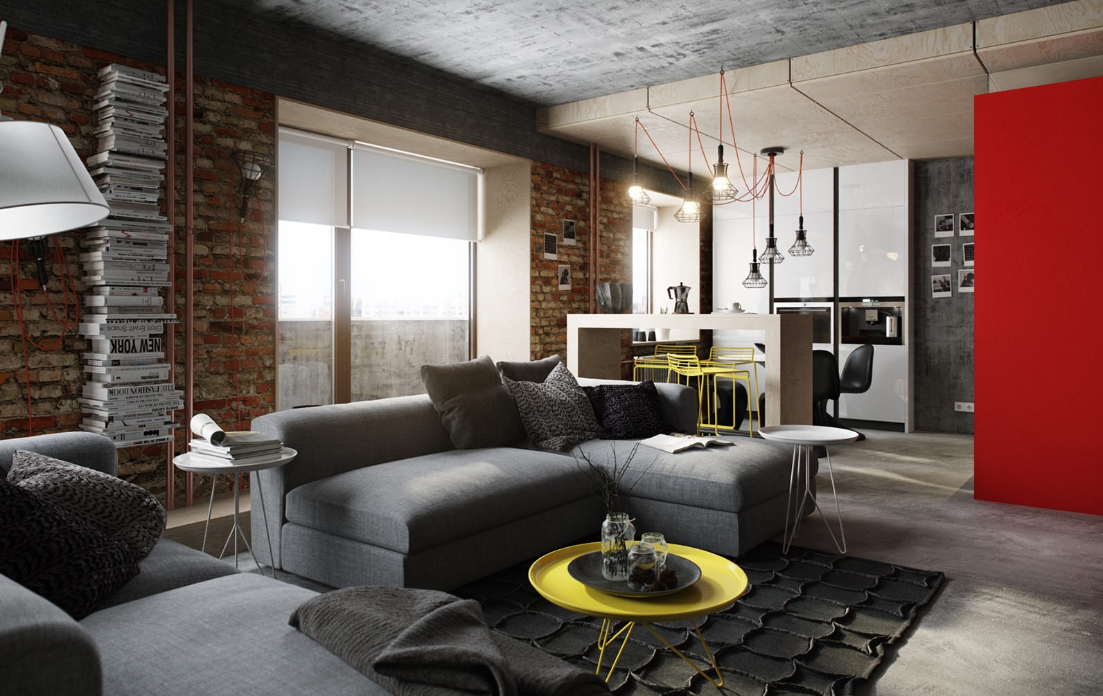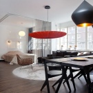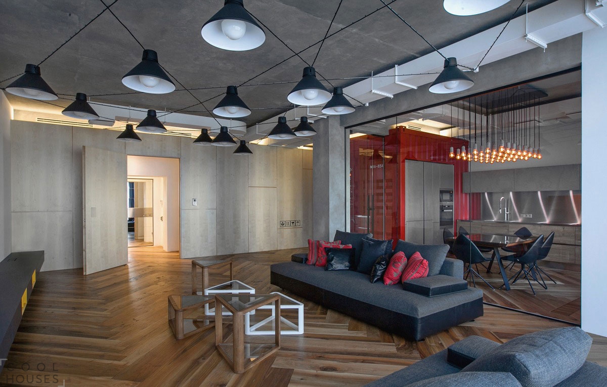 You can’t surprise anyone with a colorful loft, the only requirement is that the colors should “shout”, feel free to declare themselves.The bright red cord for a soft “spider” chandelier perfectly approached the interior, delicately adding a juicy accent.
