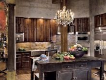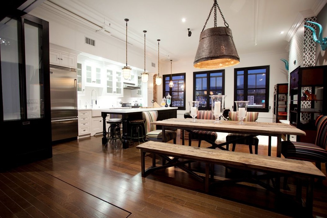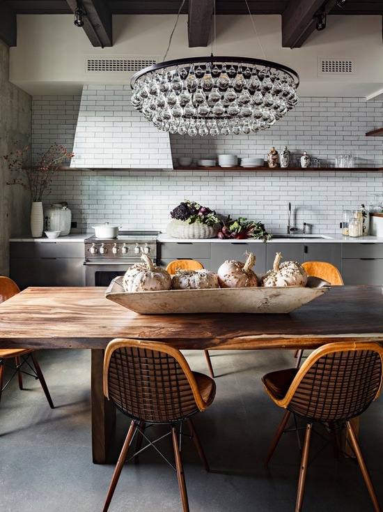 - In the kitchen The use of aluminum lampshades or track tires above the table is encouraged. In general, a loft chandelier for the kitchen is the best choice as it does not occupy floor space, leaving more room for maneuvers. Glass models will not fit in here, the underlined neglect of pretentiousness for a taboo kitchen.