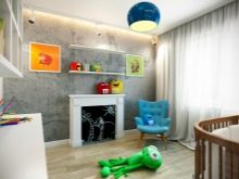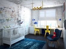 - If you ventured to issue loft-style nursery, for her it is definitely worth picking up a flexible “spider” construction made of bright plastic. The chandelier should be mounted under the ceiling, so that the child could not reach it and get an electric shock. An interesting choice will be the installation of tire structures, supplemented by searchlights, or the choice of a large and bright plastic sphere. By choosing a sphere with perforations that creates the illusion of the night sky, you will make your child happy and make the lighting more interesting.