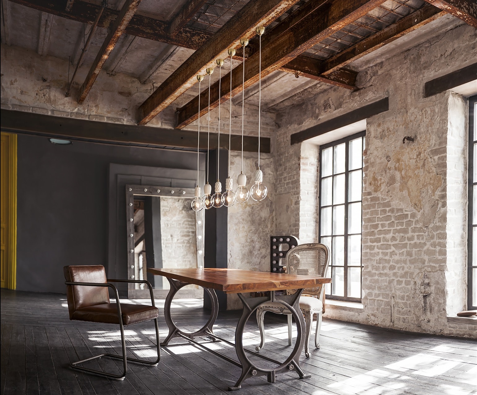- The more industrial look the suspended structure has, the better. Ideally, lighting fixtures should be chosen in such a way that they look like new designs from old factories and plants.