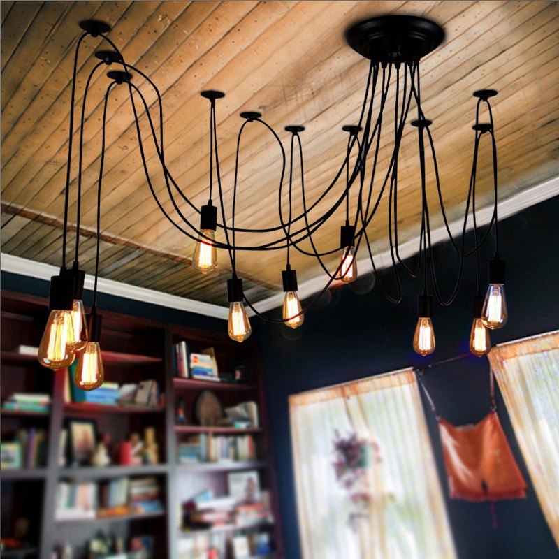 For loft rooms are selected various chandeliers, ordinary and not. One of the most famous is the so-called spider - heavy round design with bulbs in a circle, located on the frame, resembling spider legs. Nowadays, there are variations, for example, a spider on flexible legs-cords, picked up with the help of a special device-holder fixed under the ceiling. If you hang the lamps on the cords without a device-holder, you will get another typical option for the loft.