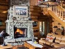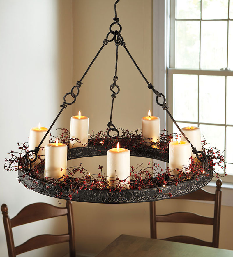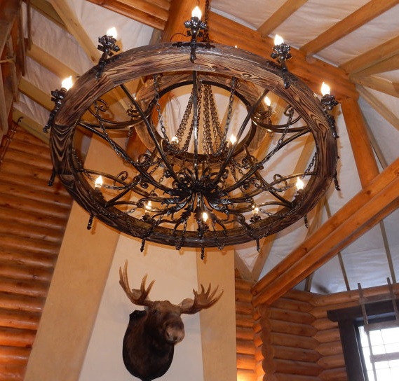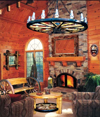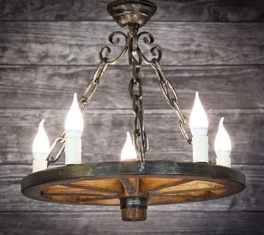 Decorative country style country, which originated in America, is widely used for decoration of private and country houses. The nature surrounding the building perfectly harmonizes with the style. This area combines ethnic notes, comfort and homely warmth. Its main characteristic is the use of a large amount of wood. Chandelier in the form of a wheel is perfect for this style.