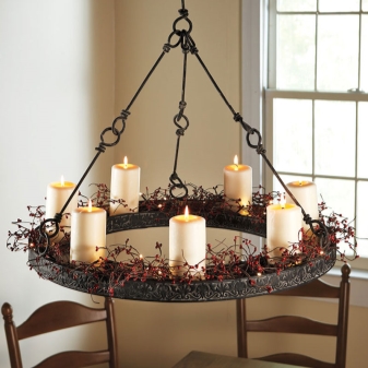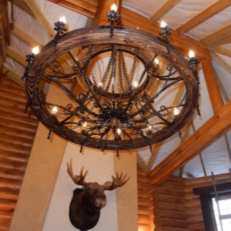 The standard wheel chandelier is quite large. The diameter of such a product is about half a meter. Given these parameters, a large lamp is better placed in a spacious room. Due to the shape and size of this lamp perfectly illuminate a large room, decorated in the style of an old castle.