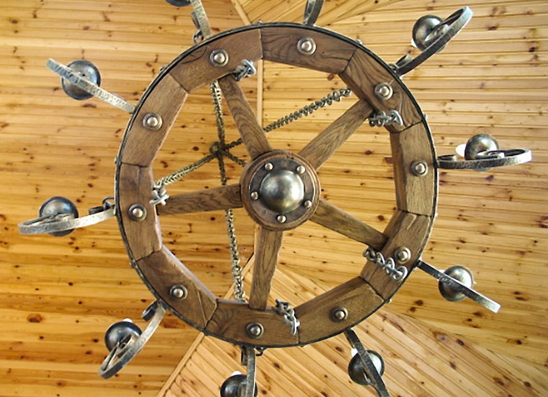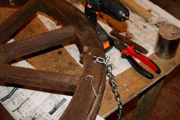 In the event that it is not possible to find the basis for the chandelier, you can make it yourself. A wooden product in the shape of a wheel, imitating its appearance as much as possible, is not at all necessary to do in accordance with outdated technologies, since it is not necessary to transport people and goods. In this case, the main thing is the maximum visual similarity, not the functional qualities of the wheel. For the manufacture will need certain materials, tools, equipment.