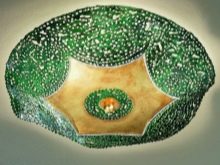 The base is often complemented by glass or crystal. Crystal make refined pendants.Glass can be frosted or colored. Also there are options with stained mosaic glass. The surface of the product can also be decorated with crystals.